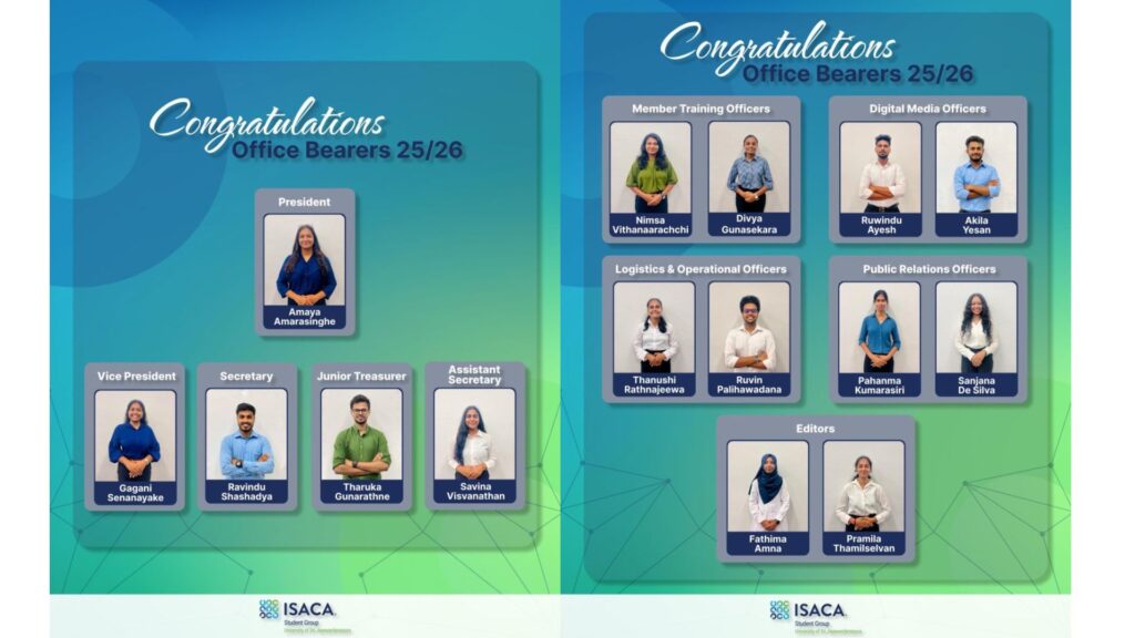 The University of Sri Jayewardenepura’s ISACA Student Group (USJ ISG) celebrated a significant milestone with the successful hosting of its Annual General Meeting (AGM) for 2025/26 on October 22, 2026, with the presence of Mr. Prabhasara Athurupane, Faculty Advisor of USJ ISG. The event was held at the Faculty of Management Studies and Commerce, creating an atmosphere of enthusiasm, achievement, and forward-looking energy.