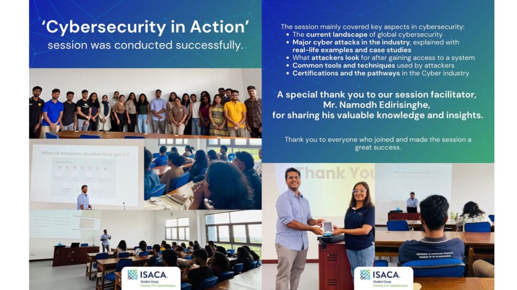 The ISACA Student Group (USJ ISG) successfully hosted the Cybersecurity in Action session on 2nd January 2026 at the Language Lab (E408), Faculty of Management Studies & Commerce. The session aimed to bridge the gap between classroom theory and real-world cybersecurity practices, giving students a unique opportunity to learn from industry experience.